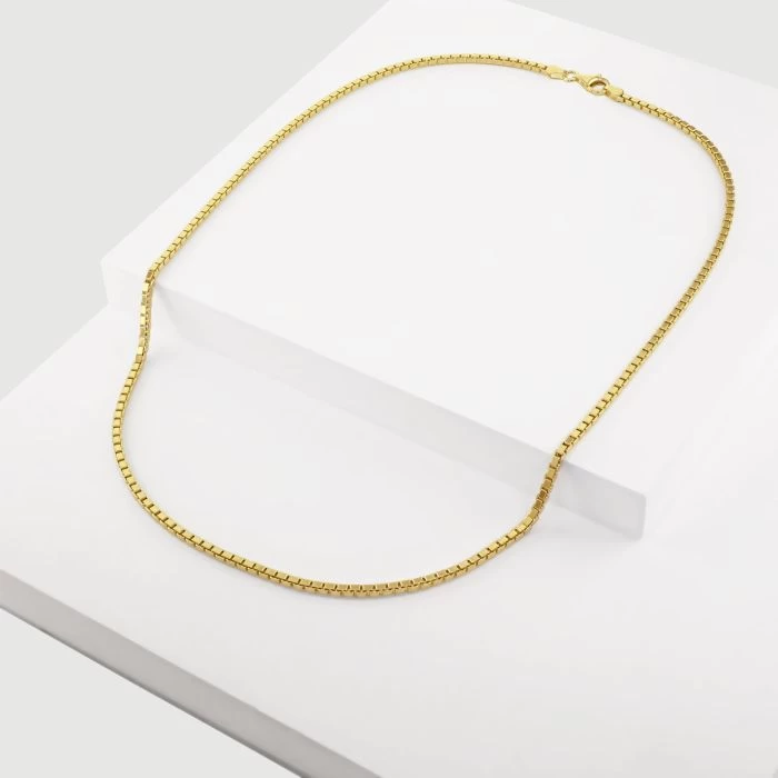 Timeless by name, classic by nature makes this luxurious 2.3mm Italian Sterling Silver box chain one of the most celebrated styles throughout the world. Characterised by its iconic geometric cube links and ascentuated with diamond cutting on the edges for refinement. Enhanced with a layer of real 9ct yellow gold for added luxury, our premium gold plated on Sterling Silver Chains have a much thicker layer than can be found in the jewellery market and therefore best value in addition to being a fantastic alternative to more expensive solid 9ct gold Chains.. Very versatile to wear by both Men and Women, either on it’s own or with a pendant. Perfect for casual wear and special occasions.