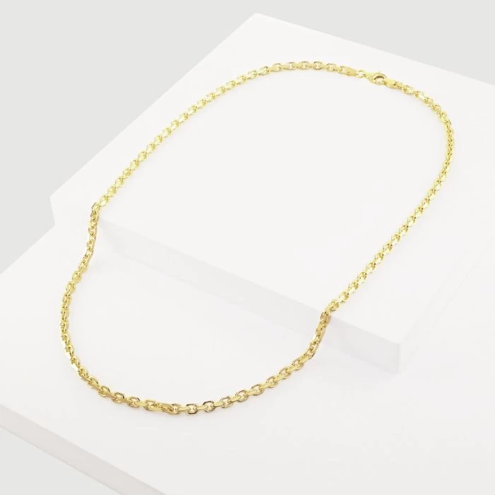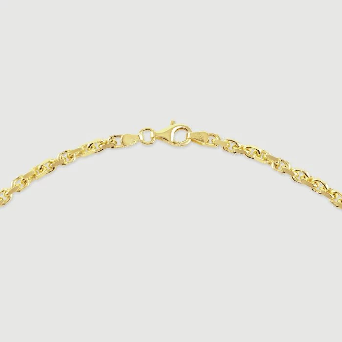 A symbol of strength and stability, this spectacular 3.5mm Italian Anchor chain has been made in solid Sterling Silver and nicely shaped with vertical diamond cut links to create a smooth clean facet on each side of the links. Polished to a high mirror polish and enhanced with a layer of real 9ct yellow gold for added luxury, our premium gold plated on Sterling Silver Chains have a much thicker layer than can be found in the jewellery market and therefore best value in addition to being a fantastic alternative to more expensive solid 9ct gold Chains. Nicely weighted and extremely durable to wear.