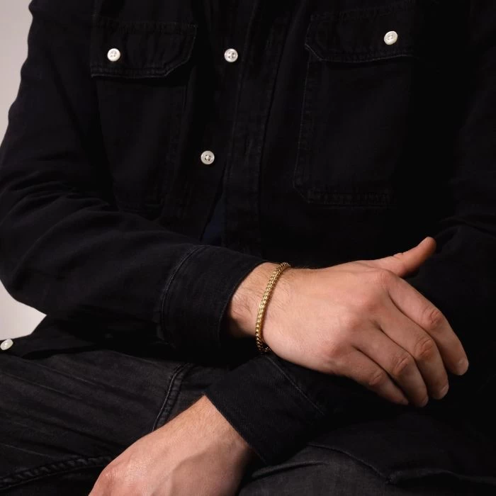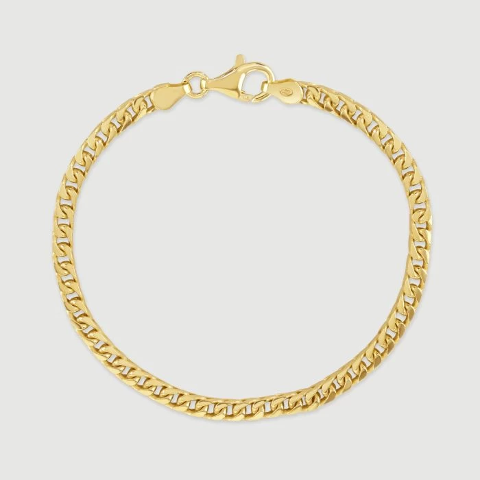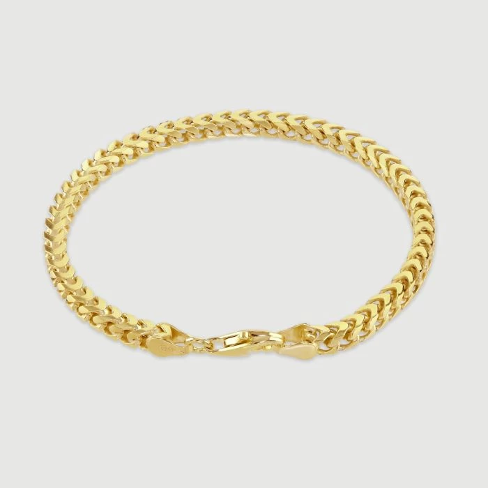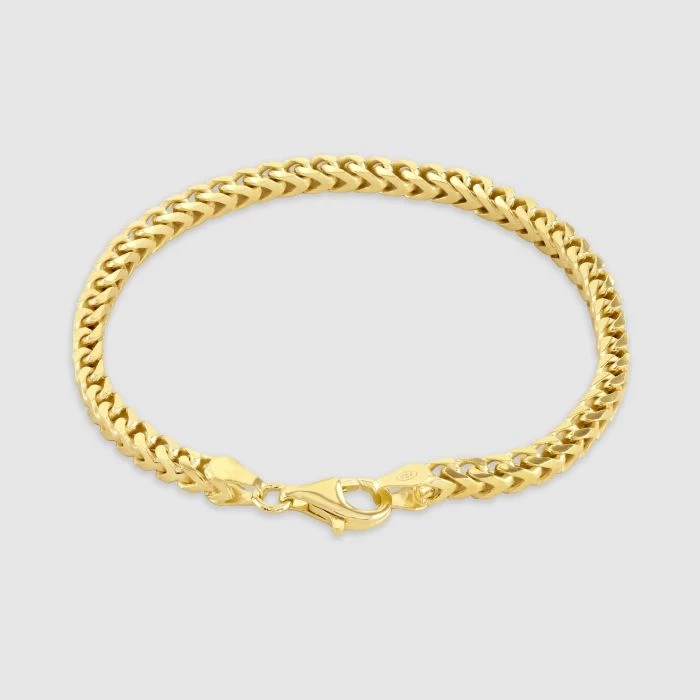 Trending hot right now is this super sleek 4mm Italian Franco bracelet made in solid Sterling Silver. The link profile encompasses a four-sided squarish shape with rounded edges which are cleverly interwoven to create a unique dual pattern not found on any other bracelet. Two sides appear to show the timeless classic curb link style whilst the other two sides show a fantastic chevron pattern along the bracelet all finished in a high mirror polish. Enhanced with a layer of real 9ct yellow gold for added luxury, our premium gold plated on Sterling Silver bracelets have a much thicker layer than can be found in the jewellery market and therefore best value in addition to being a fantastic alternative to more expensive solid 9ct gold bracelets.. Perfect to wear with any attire and occasion.