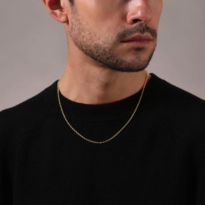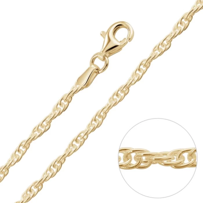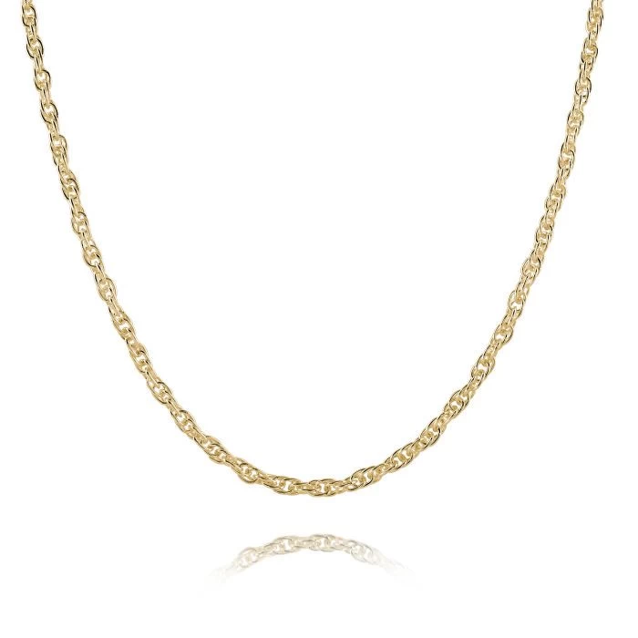 Showcase your individuality with this stunning 9ct Yellow Gold Plated 2mm Sterling Silver Loose Rope chain also known as the Prince of Wales for its classy yet traditional feel. Featuring the carefully intertwined links which naturally twist in unison to form a flexible loose rope pattern. Nicely light weight the multiple links provide surprisingly great support and strength making this chain perfect to wear as an everyday accessory simply on its own or with any pendant of your choice. Enhanced with a premium layer of real 9ct yellow gold for added luxury. Our premium gold plated on Sterling Silver chains have a much thicker layer than can be found in the jewellery market and therefore best value in addition to being a fantastic alternative to more expensive solid 9ct gold chains.
