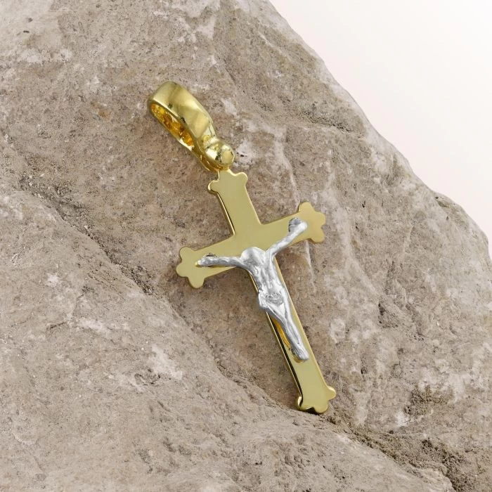 This classic crucifix pendant is made from solid Sterling Silver with its shape iconic of the ‘Trefoil’ arms which encompasses three rounded buds or lobes at the ends. The design is often associated with the Holy Trinity in Christian belief, representing the Father, Son, and the Holy Spirit as three distinct unified entities. Exceptionally made to the highest quality, the cross itself being plated with a premium layer of real yellow gold and complimented with Christ in silver, to create a wonderful two-tone finish.