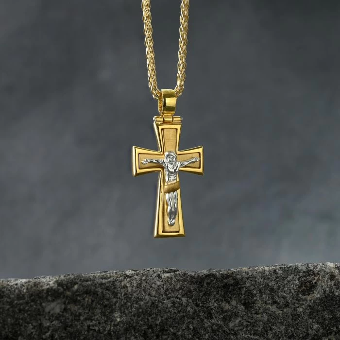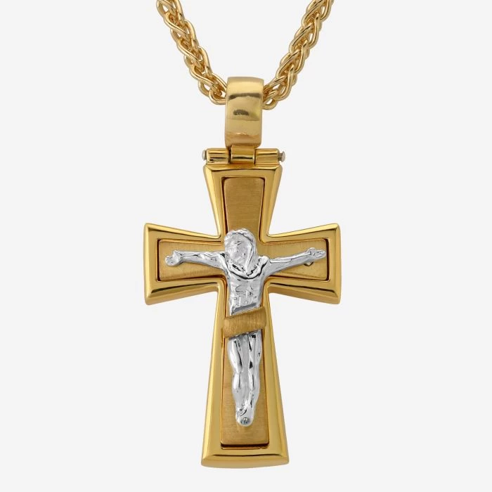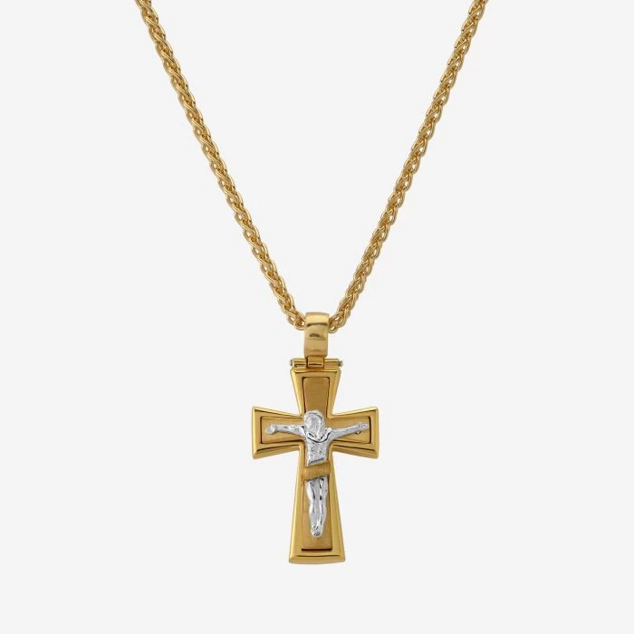 This classic large 3d crucifix pendant is made from solid Sterling Silver in a clean geometric shape derived from the traditional byantine shaped Christian cross. Exceptionally made to the highest quality, the cross itself being hollow for lightness, plated with a premium layer of real yellow gold and complimented with Christ in silver, to create a wonderful two-tone finish.