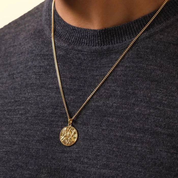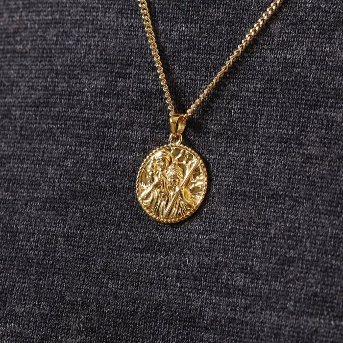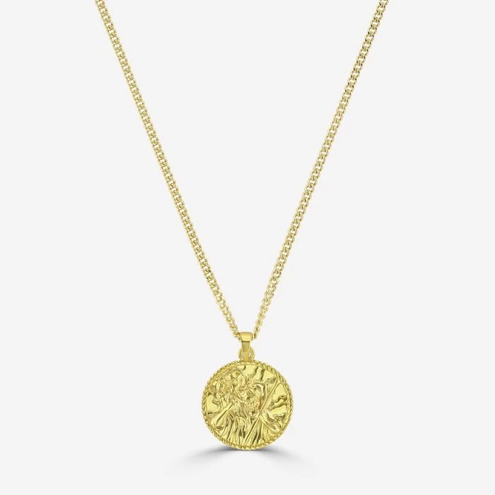 Truly one of a kind, our Gold Plated Sterling Silver St Christopher necklace is designed and crafted exclusively at The Chain Hut to honour the great patron saint to keep travellers safe on their journeys – Saint Christopher. This nicely weighted 20mm round St Christopher is vividly detailed to capture the image of St Christopher carrying Jesus on his shoulders. Each pendant is beautifully accented with a highly polished traditional rope edged border design and individually polished by hand for the most luxurious look. The reverse of each piece is finished with a matt silky satin texture -providing the perfect space for optional engraving to further personalise this token of best wishes.