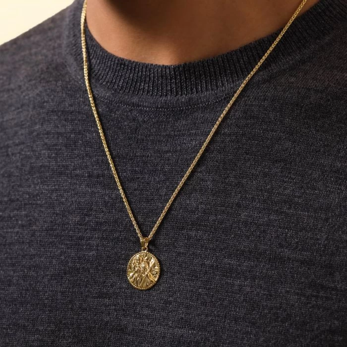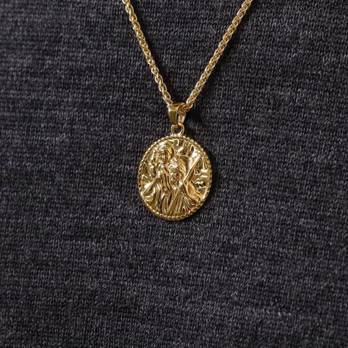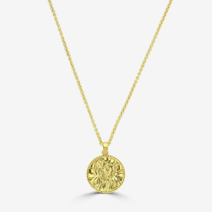 Truly one of a kind, our Gold Plated Sterling Silver St Christopher necklace is designed and crafted exclusively at The Chain Hut to honour the great patron saint to keep travellers safe on their journeys – Saint Christopher. This nicely weighted 20mm round St Christopher is vividly detailed to capture the image of St Christopher carrying Jesus on his shoulders. Each pendant is beautifully accented with a highly polished traditional rope edged border design and individually polished by hand for the most luxurious look. The reverse of each piece is finished with a matt silky satin texture -providing the perfect space for optional engraving to further personalise this token of best wishes.