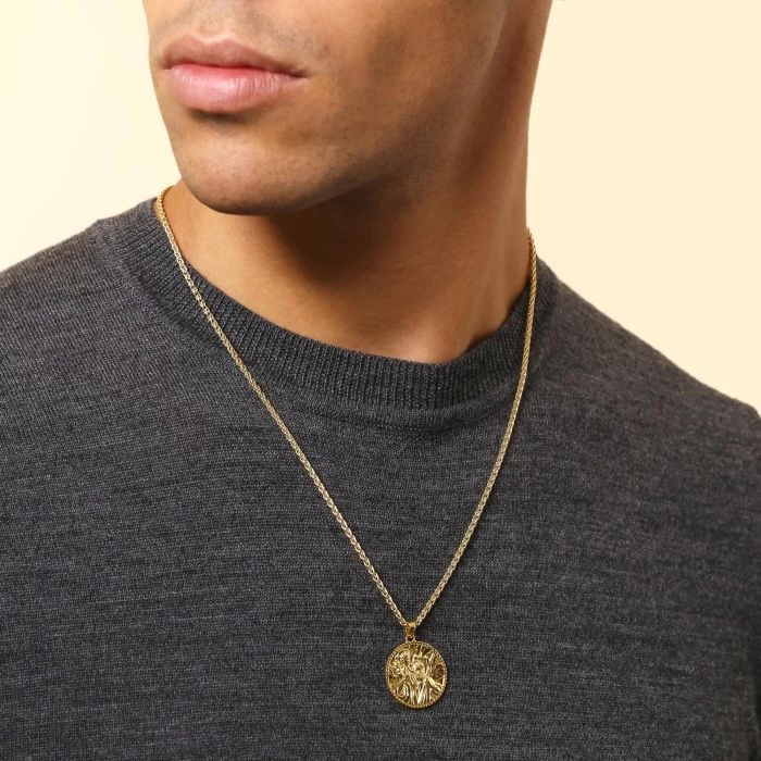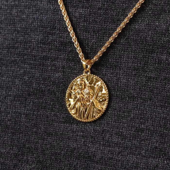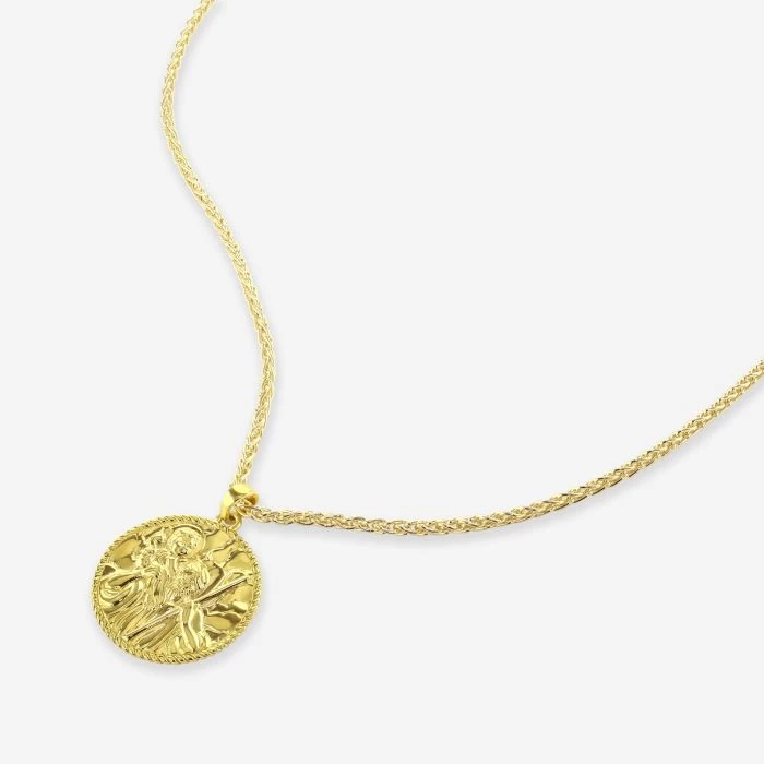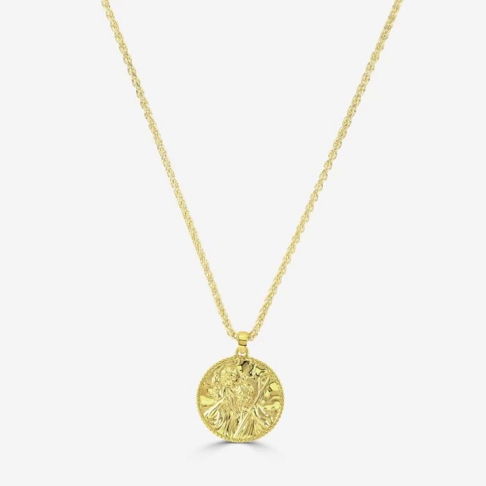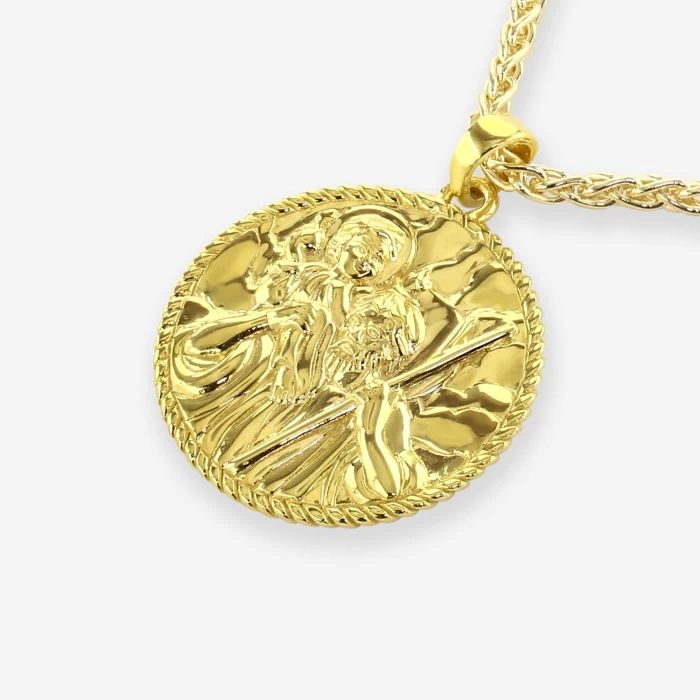 Truly one of a kind, our Gold Plated Sterling Silver St Christopher necklace is designed and crafted exclusively at The Chain Hut to honour the great patron saint to keep travellers safe on their journeys – Saint Christopher. This nicely weighted 24mm round St Christopher is vividly detailed to capture the image of St Christopher carrying Jesus on his shoulders. Each pendant is beautifully accented with a highly polished traditional rope edged border design and individually polished by hand for the most luxurious look. The reverse of each piece is finished with a matt silky satin texture -providing the perfect space for optional engraving to further personalise this token of best wishes.