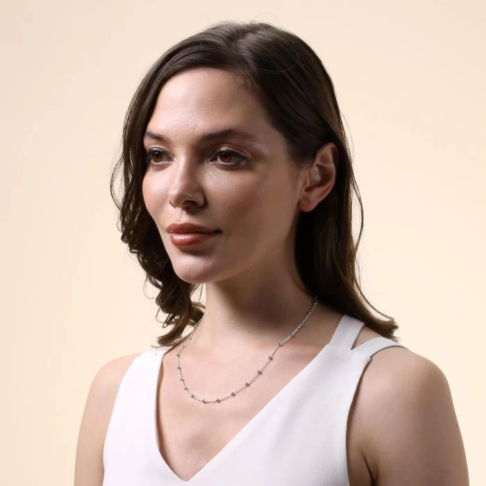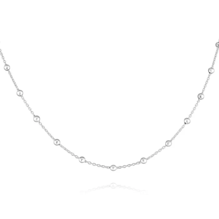 A stunning Sterling Silver Forzatina Trace link beaded chain necklace, that is versatile to wear in the day or during evenings out it’s a style that will compliment any outfit stylishly. Addictively smooth to the touch, this chain necklace also known as a Bobble chain, features a strand of pretty 3mm round mirror polished ball beads which have been interspersed at intervals along the 1.3mm Trace chain.Â