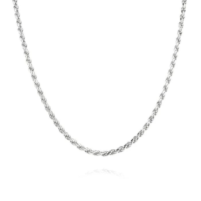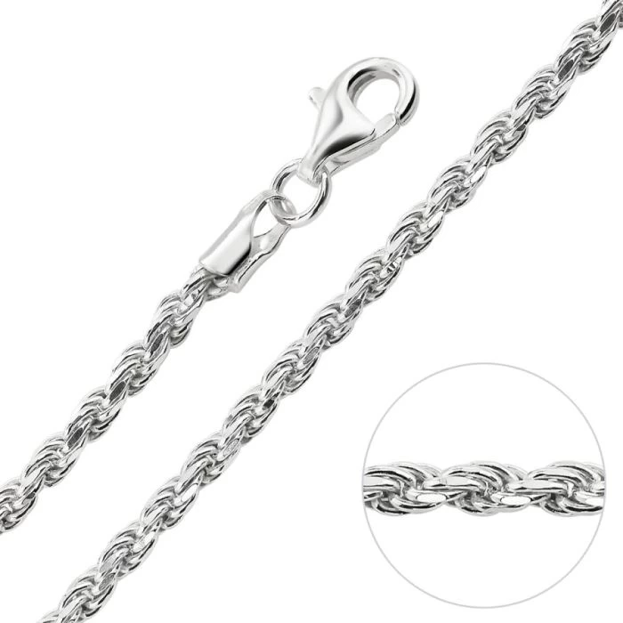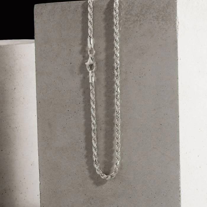 Timeless, classic and ultra stylish this fantastic Italian 2.3mm Sterling Silver Rope chain features a characteristic link design comprising of a series of intertwined rings which naturally form a twist pattern resembling a rope chord. In addition to being made to a highly polished mirror finish the rope links have been enhanced with clever diamond cutting to make subtle facets on the edges to allow light to reflect brilliantly. Versatile to wear as an everyday jewellery piece and can be enjoyed for many years to come.