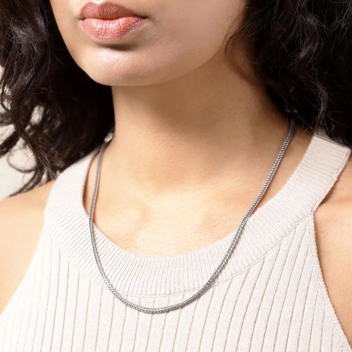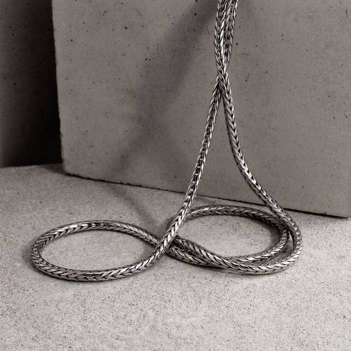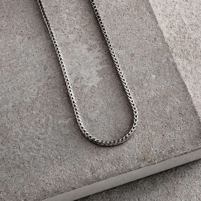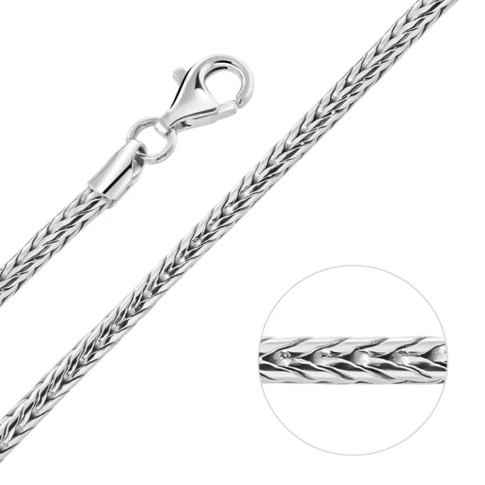 With a vibrant texture to the touch, and a sleek appearance, our 2.5mm Round solid Sterling Silver Foxtail chain is a stunning design comprising of a series of interconnecting rounded chevron or V shaped links which gives the chain a striking similarity of a fox’s tail. Enhanced with a layer of Rhodium plating for protection against tarnish.Â