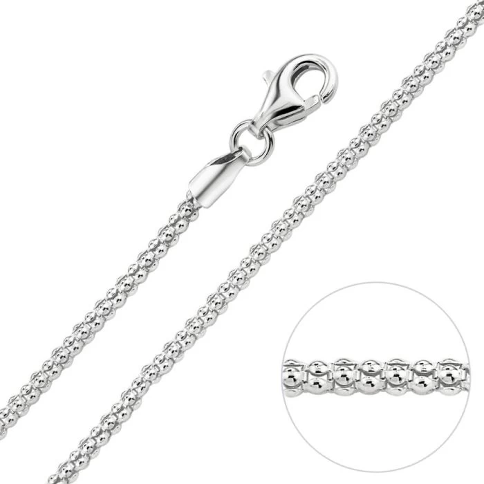 Glamorous, contemporary and distinctive, this super sexy Italian 2mm Sterling Silver Popcorn chain is one of our hot favourites for its characteristic profile resembling a strand of popcorns. This design evokes playfulness with a class of sophistication and will get you plenty of compliments. Lightweight and finished in a high mirror polish. The perfect choice for nights out and special occasions with that stunning outfit. Can be worn simply on its own or with any small light weight pendant of your choice.