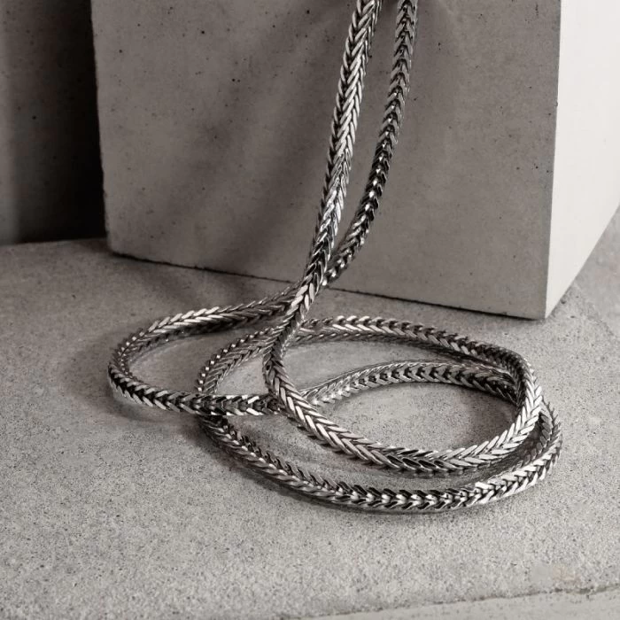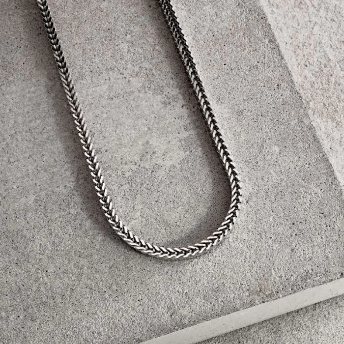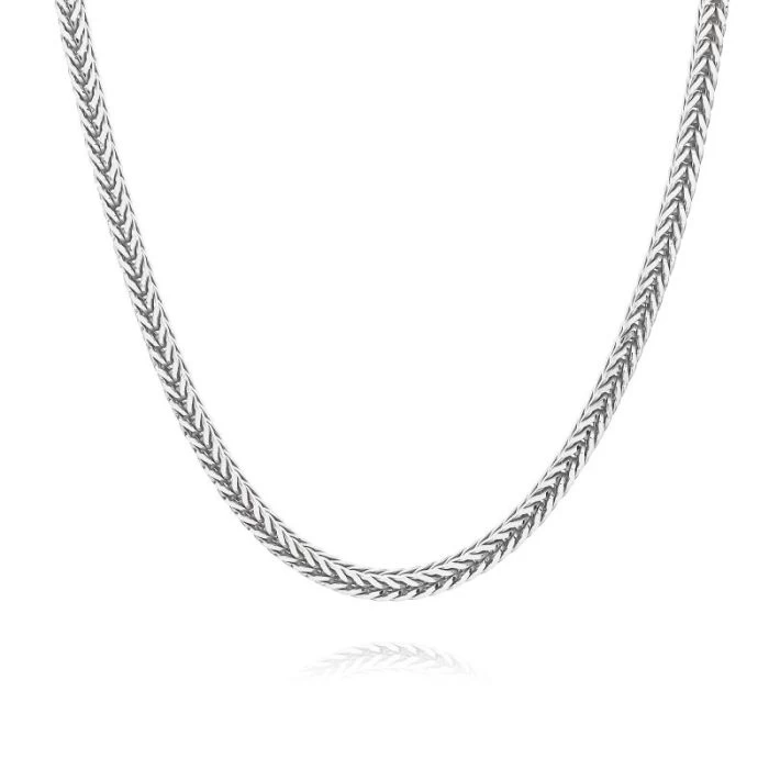 Looking for something totally unique from what’s out here in the jewellery world? Look no further than this fantastic heavy luxurious Italian 3.1mm solid Sterling Silver Foxtail chain. A very rare chain style exclusive to The Chain Hut featuring a stunning design comprising of a series of interconnecting square chevron shaped links which gives the chain a striking similarity of a fox’s tail. Enhanced with Rhodium plating for protection against tarnish. Nicely weighted and durable to wear everyday.