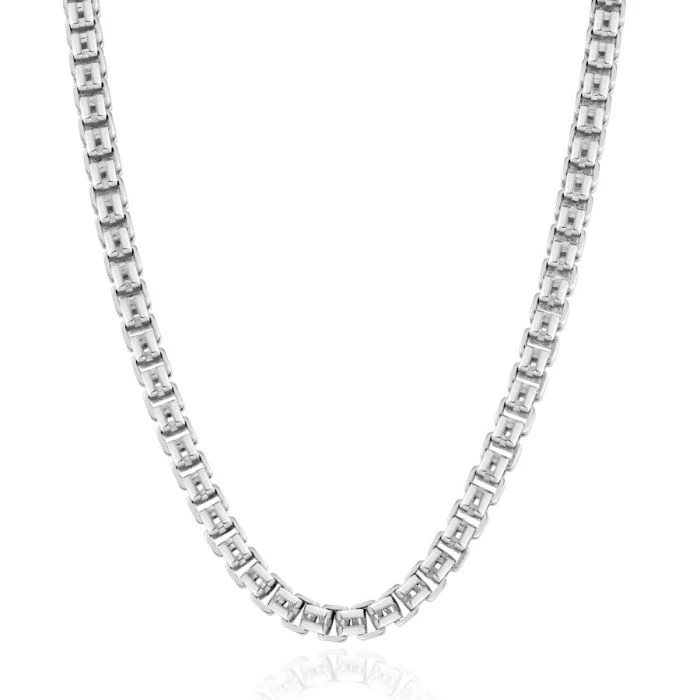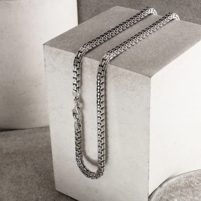 Slicker than your average, this luxurious 3.9mm diamond cut Italian Double Box chain is perfect if you’re looking for something that little different. Made in solid Sterling Silver and originating from the fantastic classic box chain design, this version has been nicely elavated with a groove cut in the centre each side of the link creating a double box appearance. Finished with a premium layer of Rhodium plating to protect against tarnish and finished in a high mirror polish.
