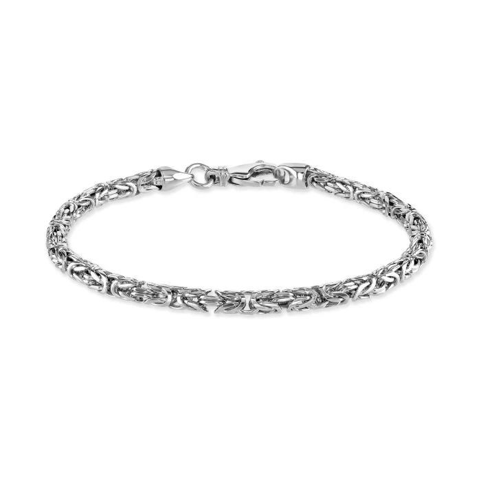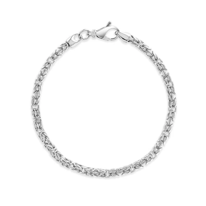 It is said that great style and quality speaks for itself. Our 3.9mm wide Byzantine bracelet featured as one of our exclusive collections and characterised as a spectacular timeless treasure. The style originates from ancient Rome and takes particular influence from renowned Greek artwork found in many of the world’s luxurious fashion brands. Made in solid Sterling Silver using a series of intricately woven oval shaped links flatted and shaped in a rounded tubular shape creating an intriguing geometric pattern. Enhanced with a layer of Rhodium plating for protection against tarnish and to give the highly desired darker colour tone. Hand-finished to a high mirror polish and smooth feel. Exceptionally strong, durable and nicely weighted.