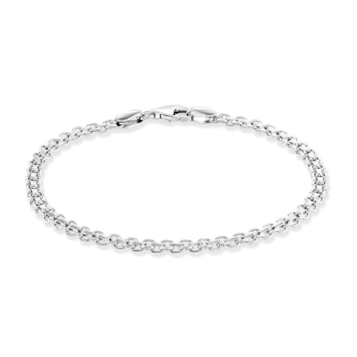 Showcase your style, celebrate your individuality with this enigmatic 3mm Italian Bismark bracelet. Made in solid Sterling Silver this lightweight bracelet characterised by its rows of interwoven diamond-cut double flat links create a shimmering mesh motif that’s sure to keep onlookers intrigued. Finished in a high mirror polish and layered with Rhodium plating to protect against tarnish for a truly luxurious feel. Can be nicely complimented with it’s matching Bismark necklace sold separately.