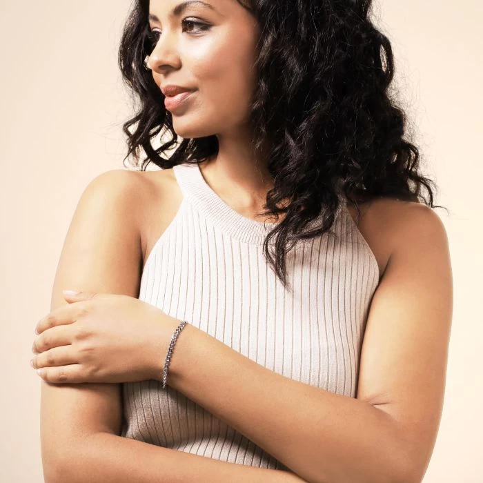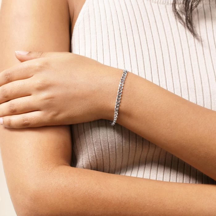 This super sleek and luxurious Italian 4.3mm solid Sterling Silver Curb bracelet featuring its iconic diamond cut links where each link has been intricately faceted at an angle to create a stunning shine. Enhanced with a layer of Rhodium plating for protection against tarnish and finished to a high mirror polish. Nicely weighted and extremely durable to wear every day.
