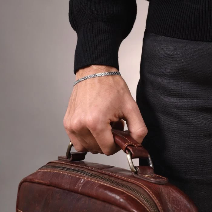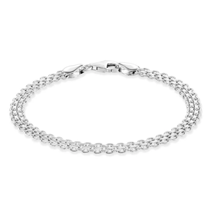 Showcase your style, celebrate your individuality with this enigmatic 4.4mm Italian Bismark bracelet. Made in solid Sterling Silver this lightweight bracelet characterised by its rows of interwoven diamond-cut double flat links create a shimmering mesh motif that’s sure to keep onlookers intrigued. Finished in a high mirror polish and layered with Rhodium plating to protect against tarnish for a truly luxurious feel. Can be nicely complimented with it’s matching Bismark necklace sold separately.