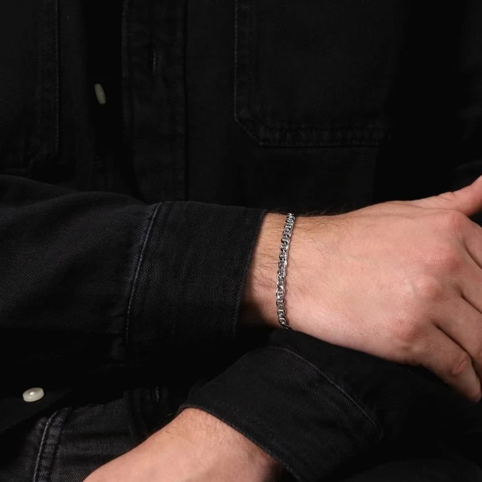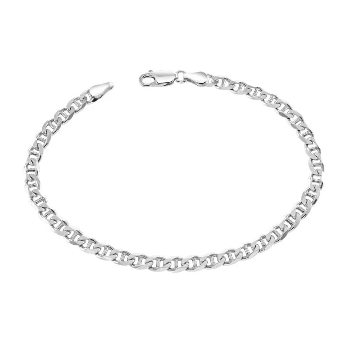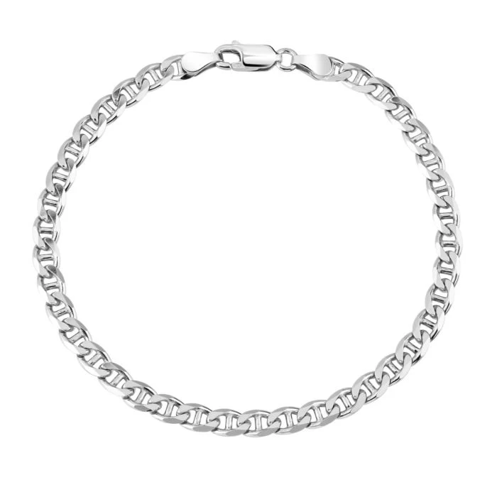 Ultra sleek and stylish this thick and heavy luxurious Italian 4.6mm solid Sterling Silver Mariner Bracelet made famous by its origin from Maritime is characterized by its series of oval shaped bar links. Each link has been intricately diamond cut with facets on the edges of each link which allows light to be captured and shine from different angles. Enhanced with a layer of Rhodium plating for protection against tarnish and finished to a high mirror polish. Nicely weighted and extremely durable to wear every day.