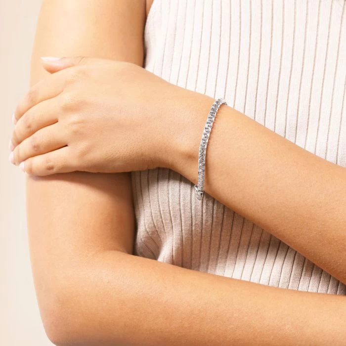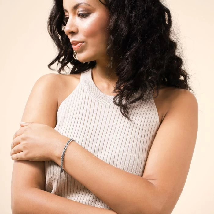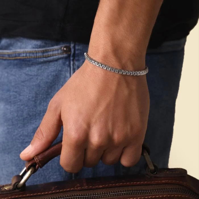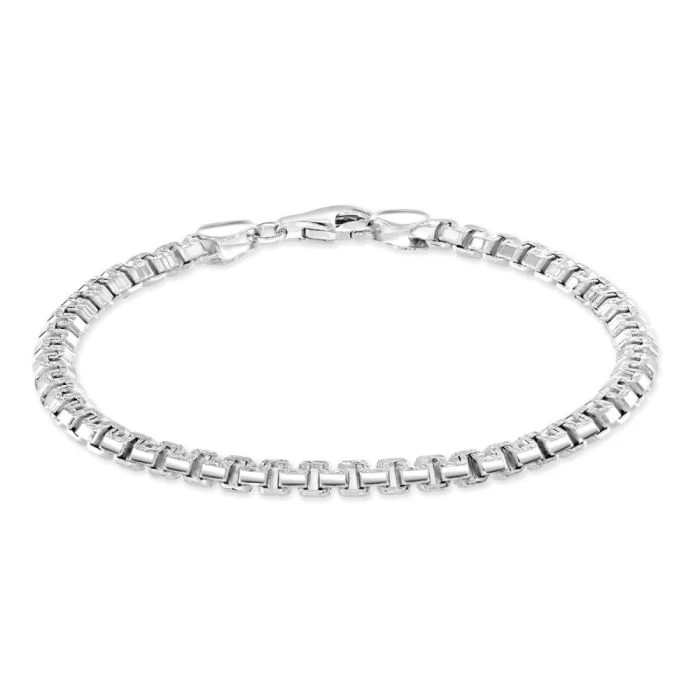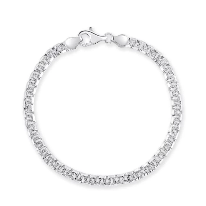 If you’re looking for something special then look no further with this fantastic 4.6mm Greek Box bracelet. Made in solid Sterling Silver with box links which have been diagonally flattened to form a continuous geometric Meandros inspired by Greek design. To ascentuate the motif, the bracelet features a pave effect visable along the surface top and bottom of the links welcoming light to naturally sparkle. Enhanced with a layer of Rhodium plating for protection against tarnish and finished to a high mirror polish.