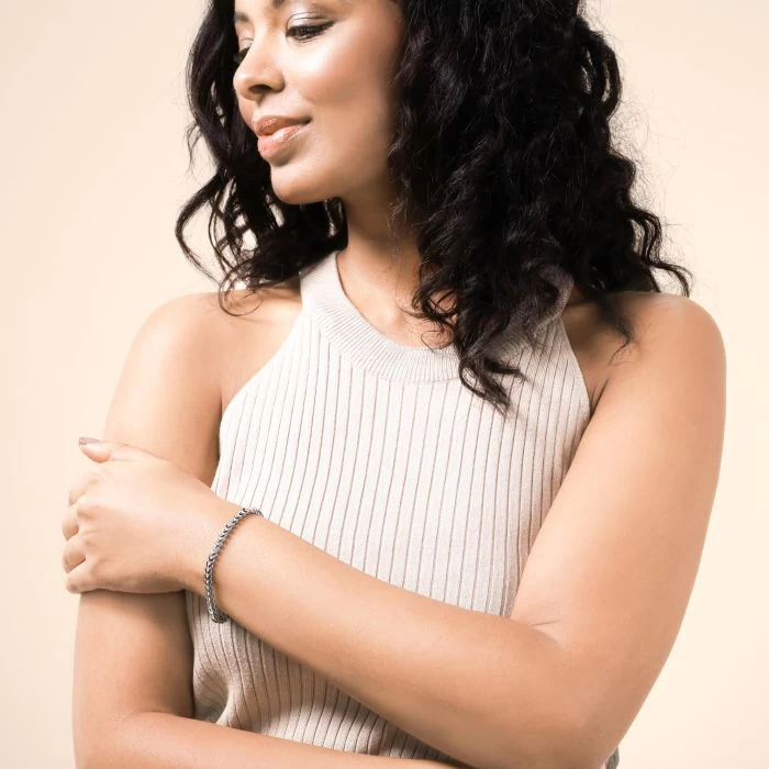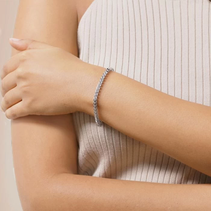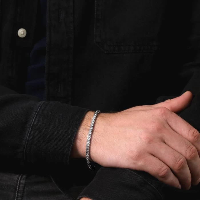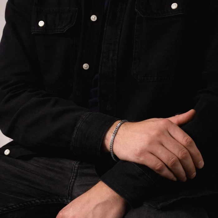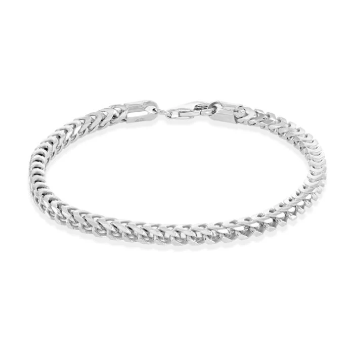 Trending hot right now is this super sleek 4mm Italian Franco bracelet made in solid Sterling Silver. The link profile encompasses a four-sided squarish shape with rounded edges which are cleverly interwoven to create a unique dual pattern not found on any other bracelet. Two sides appear to show the timeless classic curb link style whilst the other two sides show a fantastic chevron pattern along the bracelet. Finished in a high mirror polish and a premium layer of Rhodium plating for protection against tarnish. Perfect to wear with any attire and occasion.