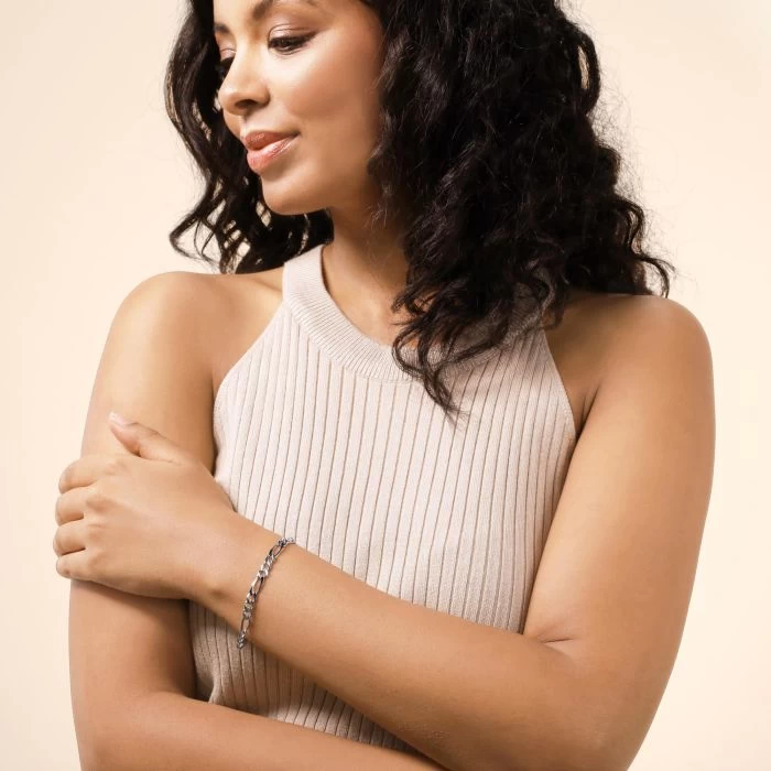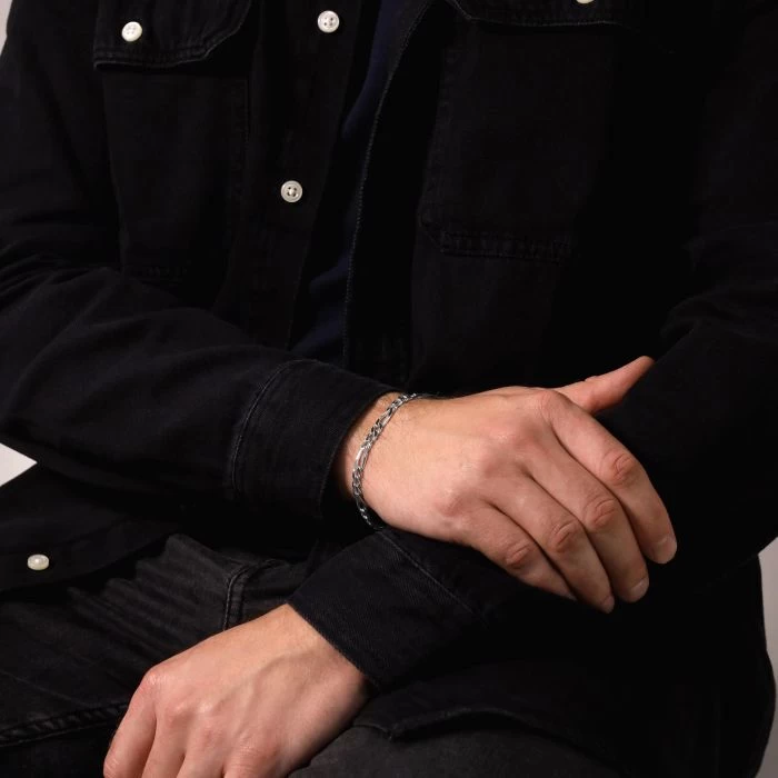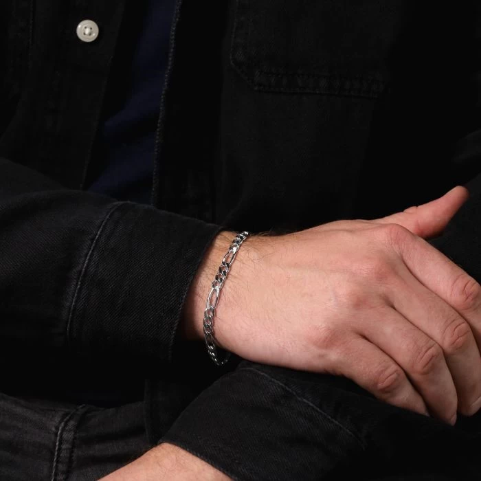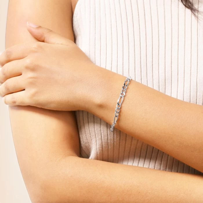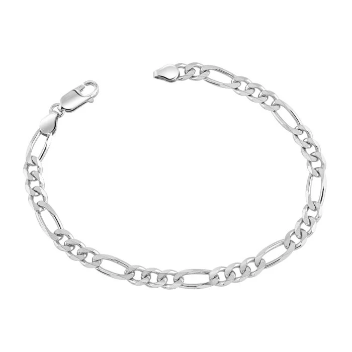 This stunning thick and heavy luxurious Italian 5.7mm solid Sterling Silver Figaro bracelet features a unique flat linked pattern of a single elongated rectangular link interlocked with three curb links. Each link has been intricately diamond cut at an angle to create a series of facets which allow light to be captured and shine from different angles. Enhanced with a layer of Rhodium plating for protection against tarnish and finished to a high mirror polish. Nicely weighted and extremely durable to wear every day. This style is regarded as one of the timeless classics and should be a staple to your jewellery collection.
