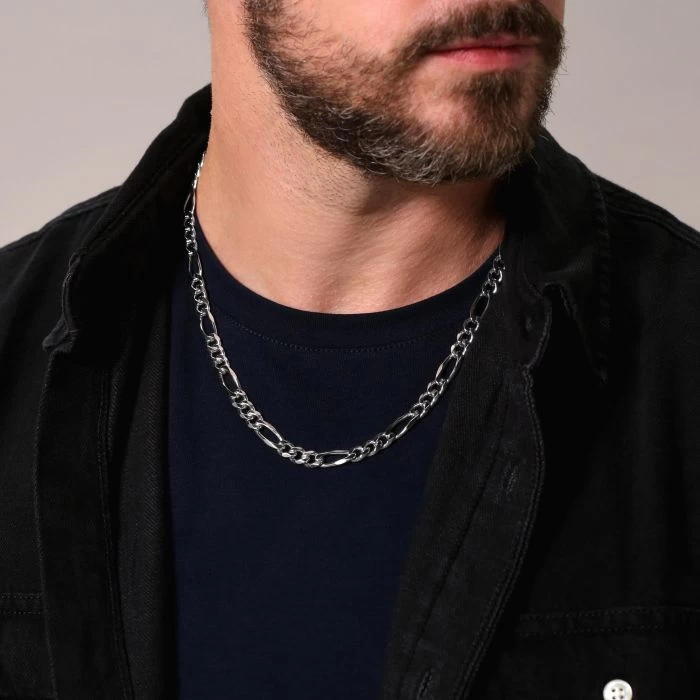 This stunning thick and heavy luxurious Italian 7.6mm solid Sterling Silver Figaro chain features a unique flat linked pattern of a single elongated rectangular link interlocked with three curb links. Each link has been intricately diamond cut at an angle to create a series of facets which allow light to be captured and shine from different angles. Enhanced with a layer of Rhodium plating for protection against tarnish and finished to a high mirror polish. Nicely weighted and extremely durable to wear every day. This style is regarded as one of the timeless classics and should be a staple to your jewellery collection.
