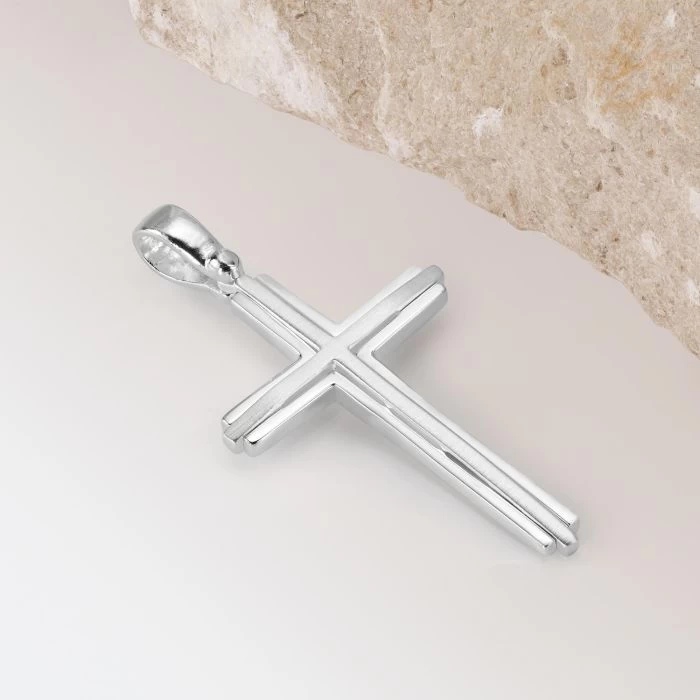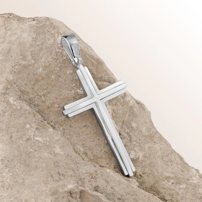 This lovely large cross pendant is made from solid Sterling Silver and exceptionally made to the highest quality. The design itself encompasses an inner section that has been finished with a brushed sateen effect and an outer section being polished, to create a stunning contrast. Complete with Rhodium plating for protection against tarnish.Â