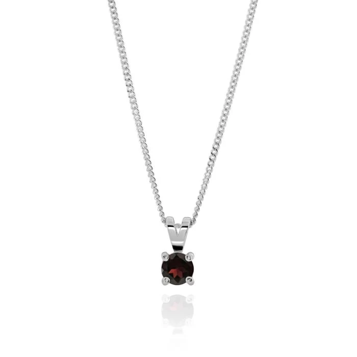 This cute 5mm Round semi-precious Garnet Gemstone pendant, said to be the lucky Gemstone for those born in January, is brilliantly faceted and encased in a solid Sterling Silver setting. Also said to be significant for the 2nd year wedding anniversary this genuine Garnet is held securely with 4 claws in a solid Sterling Silver jewellery setting. Designed in a way that allows for natural light to pass through the jewellery setting highlights the Garnet’s most attractive and natural dark red colours -an undeniably alluring treasure of the Earth.Â