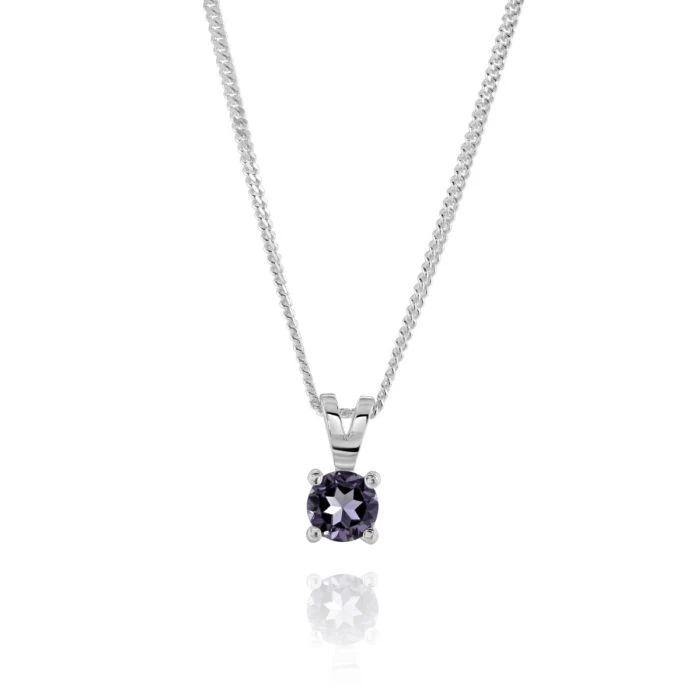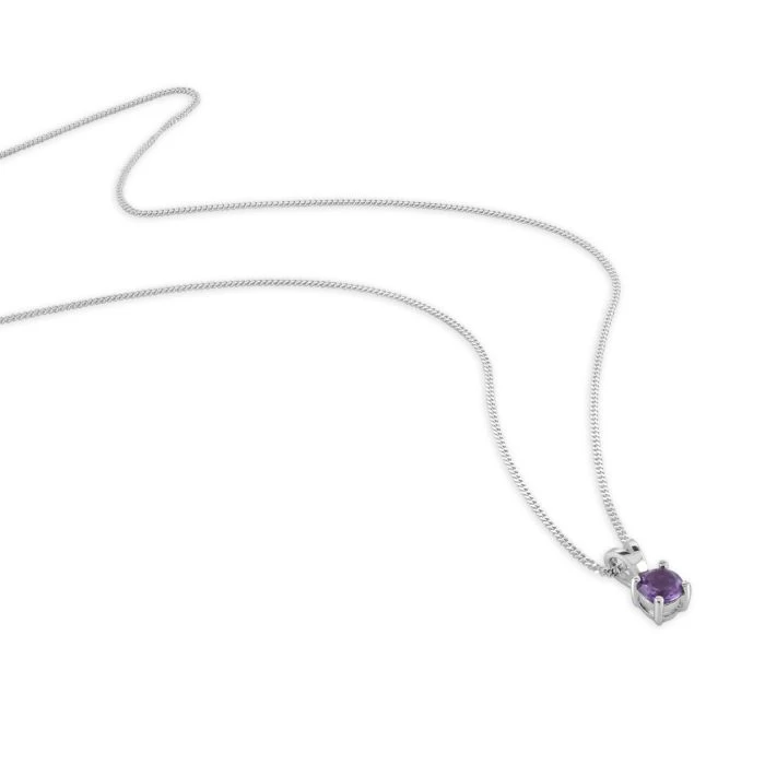 This cute 5mm Round precious Light Amethyst Gemstone pendant, said to be the lucky Gemstone for those born in June, is brilliantly faceted and encased in a solid Sterling Silver setting. This genuine Light Amethyst is held securely with 4 claws in a solid Sterling Silver jewellery setting. Designed in a way that allows for natural light to pass through the jewellery setting highlights the Light Amethyst’s most attractive and naturally captivating Purple colours -an undeniably alluring treasure of the Earth.Â
