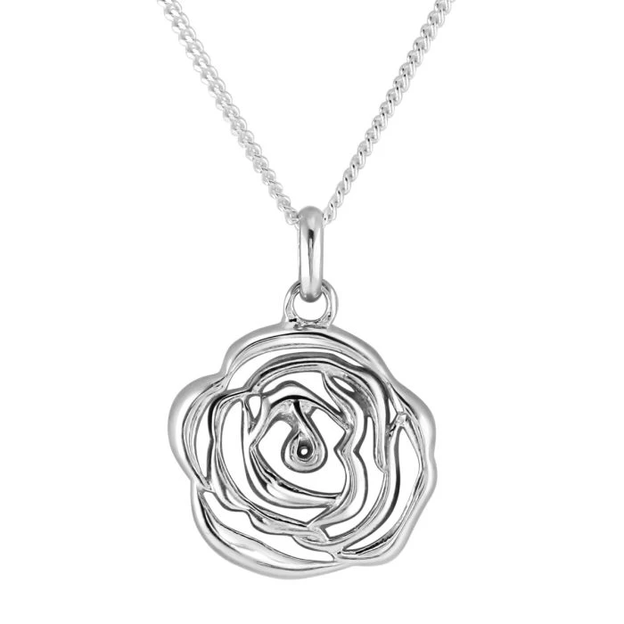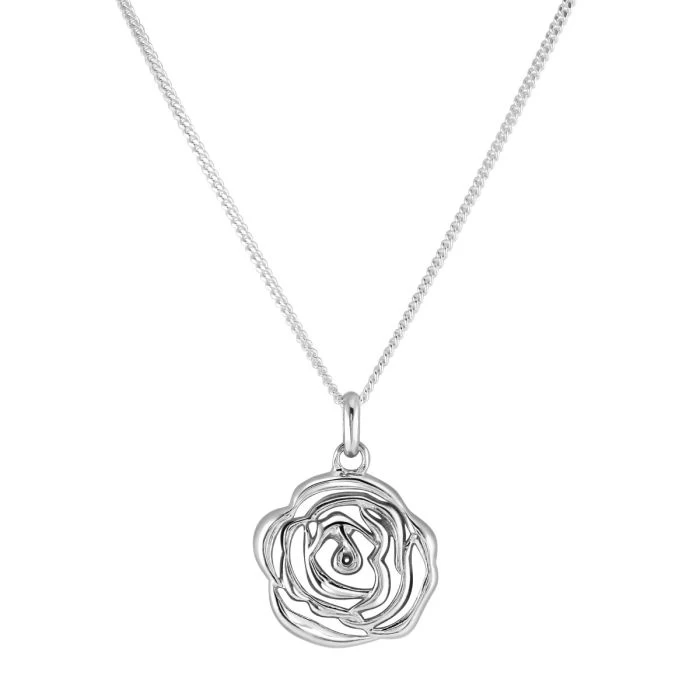 Roses aren’t just Red- they’re Silver too! Already the national flower of England and a flower for Valentine’s Day, the Rose is also attributed those that are born in the month of June and symbolic of Love, Passion and Respect. Our Sterling Silver Rose Pendant Necklace complimented with our Diamond Cut Curb Chain, captures the inflorescence of the rose and the birds eye view of its enchanting spirals that resemble love of a timeless nature.Â
